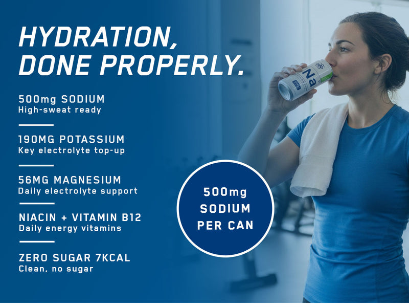 NA-11 Hydration delivers 500 mg of sodium per 330 ml can, the key electrolyte lost through sweat, alongside potassium to support fluid balance during intense sessions, endurance training, and comp