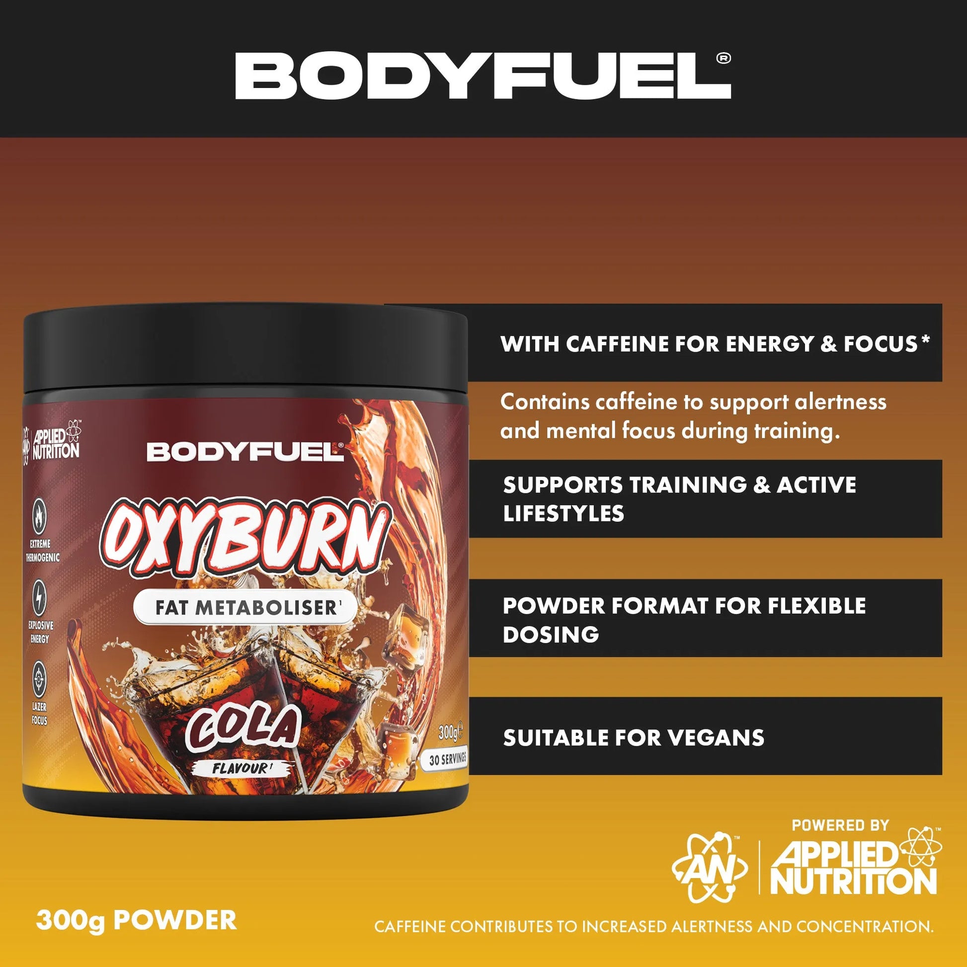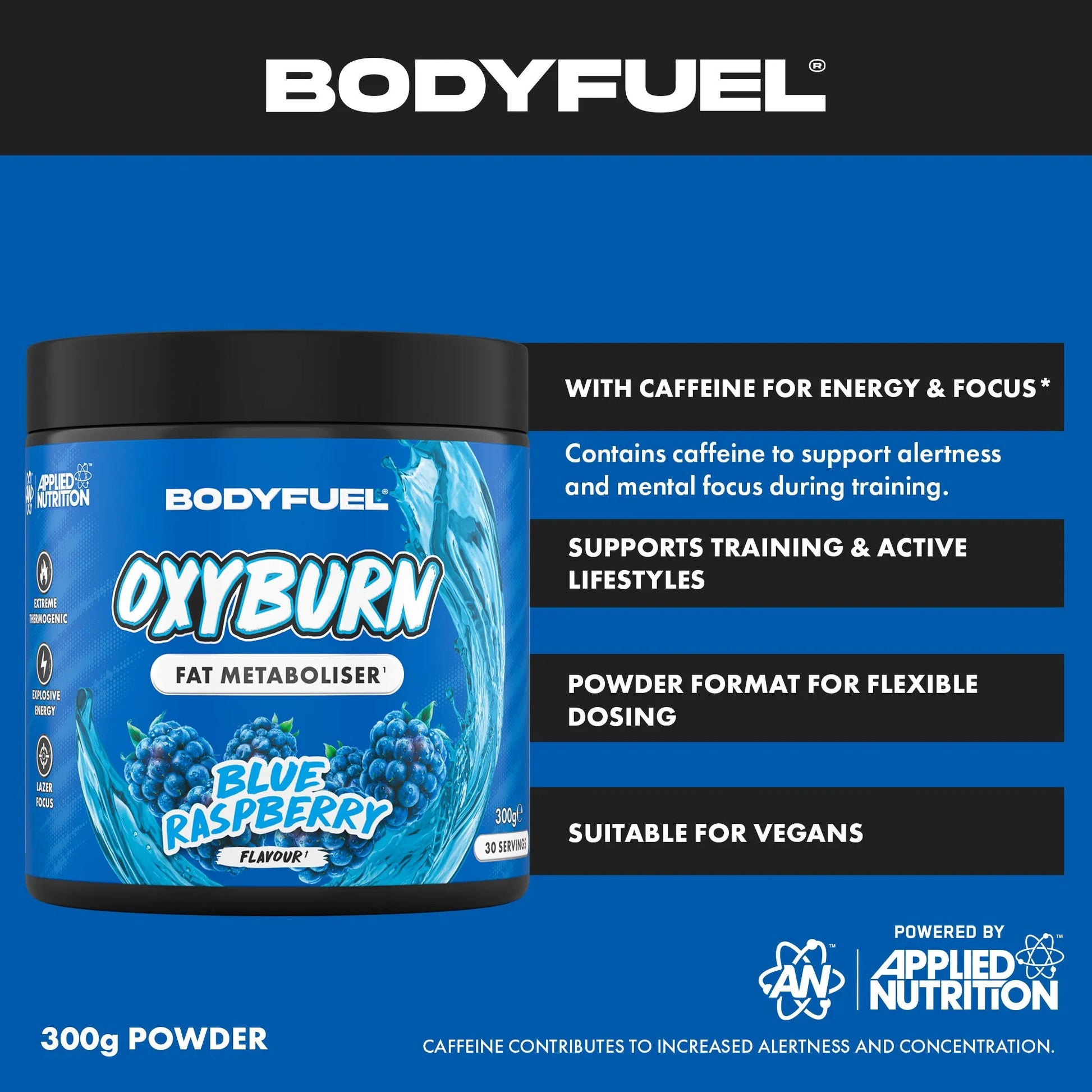 Support your metabolism and training intensity with BodyFuel™ OxyBurn. This easy-to-mix powder provides caffeine for energy and focus, plus vitamins and minerals like Zinc and Chromium to support normal macronutrient metabolism. A great-tasting, low-sugar drink for your active lifestyle.