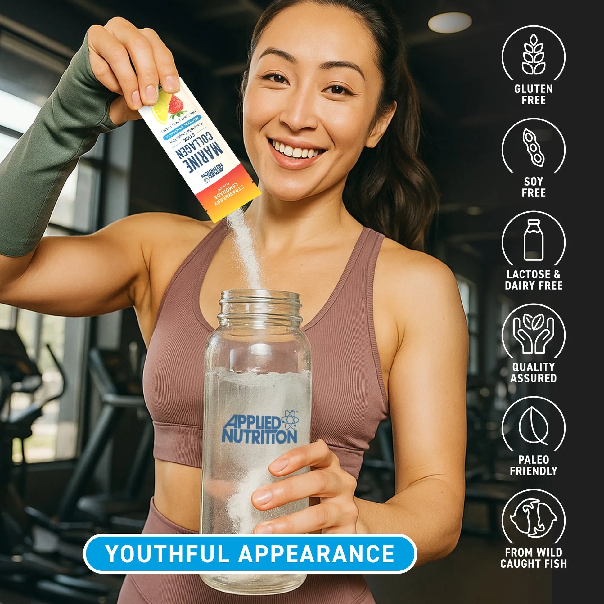 Applied Nutrition’s Marine Collagen Sticks are expertly formulated for women who value inner health and outer beauty. Each convenient, ready-to-consume stick delivers 10g to 12g of Marine Collagen, sustainably sourced from wild-caught fish for optimal absorption and efficacy.